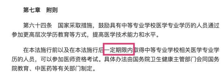 说明国家还是为中专学历医生提供了一些出路,大家要珍惜机会,尽快考证。那这个一定期限会是多久呢?这个具体办法由国务院卫生健康主管部门会同国务院教育、中医药等有关部门制定。新版医师法正式实施前的草案中曾提到「五年内」,也就是2027年之前。总之,中专学历医生要尽快考证。