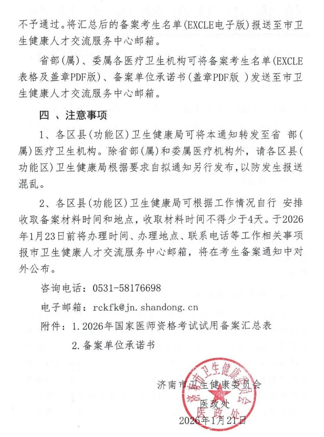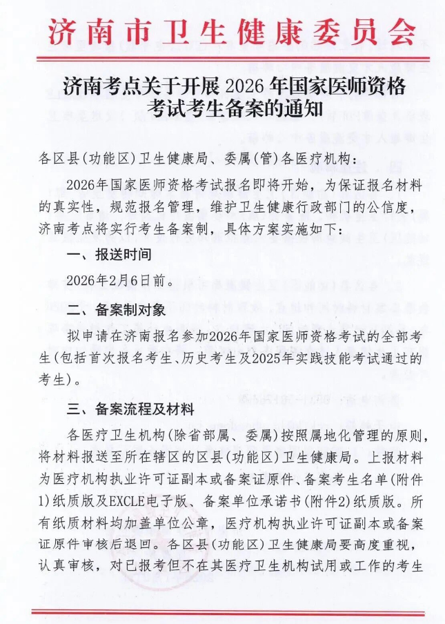 2026医师资格考试报名即将/承学网整理开始,近日济南卫健委发布文件,要求考生备案,2026年2月6日前截至,具体如下: